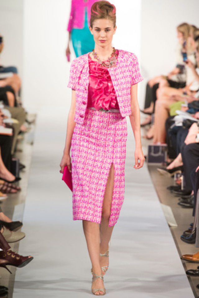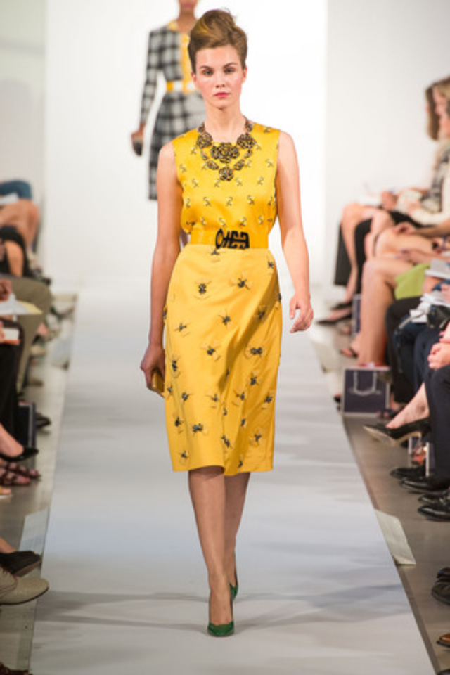 Just when I was about to say no peplums for Oscar de la Renta this season, he proved me wrong. A pastel strapless top with a peplum on the bottom made me take back my words. Two of my favorite looks are the yellow outfits Joan Smalls (1st look) and Cara Delevingne (4th look) are wearing. Two other looks that are also my favorites are the 3D green dots on the bright pink dress and jacket. It's absolutely a wow factor and show stopper. There's also a lot of lace - more than before - and high slits. .